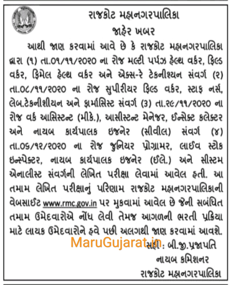 Rajkot Municipal Corporation (RMC) has published Result for FHW, MPHW, Junior Programmer & Other Posts 2020-21, Check below for more details.