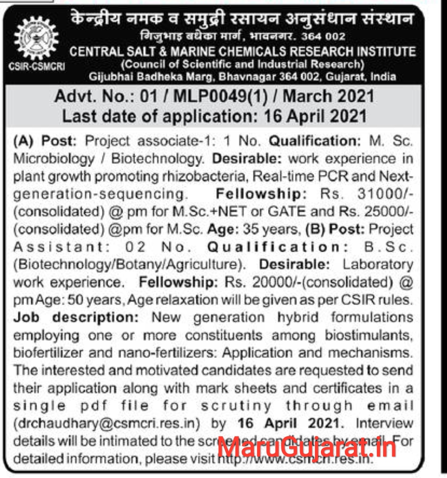 CSIR-CSMCRI has published an Advertisement for the below-mentioned Posts. Eligible Candidates advised to refer to the official advertisement and apply for this post. You can find other details like age limit, educational qualification, selection process, application fee, and how to apply are given below. Keep checking Maru Gujarat regularly to get the latest updates.