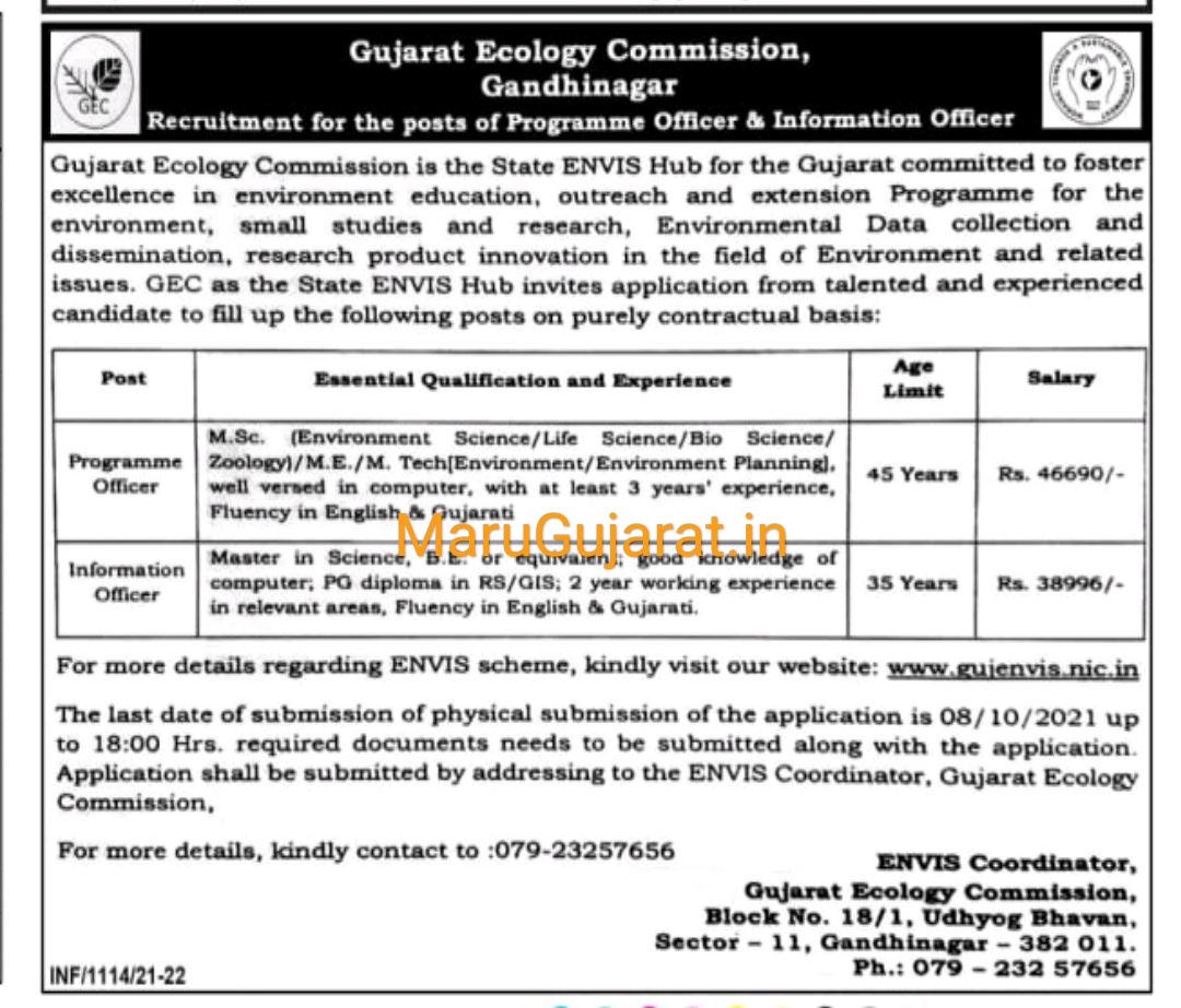 Gujarat Ecology Commission (GEC) Gujarathas published an Advertisement for the below-mentioned Posts. Eligible Candidates advised to refer to the official advertisement and apply for this post. You can find other details like age limit, educational qualification, selection process, application fee, and how to apply are given below. Keep checking Maru Gujarat regularly to get the latest updates.
