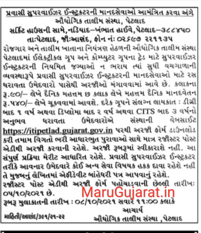 Industrial training institute (ITI), Petlad has published an Advertisement for the below-mentioned Posts. Eligible Candidates advised to refer to the official advertisement and apply this post. You can find other details like age limit, educational qualification, selection process, application fee, and how to apply are given below. Keep checking MaruGujarat regularly to get the latest updates.